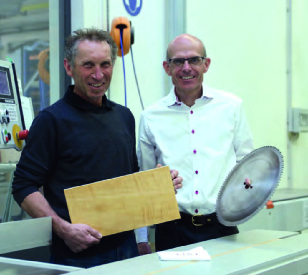 F/LIST використовує дискову пилу LEUCO DIAREX та алмазні дискові пили для розкрою плит для багатьох матеріалів навіть високоабразивних плит з видувного скла. Франц Хаусманн (ліворуч) та Роман Едельхофер (праворуч).