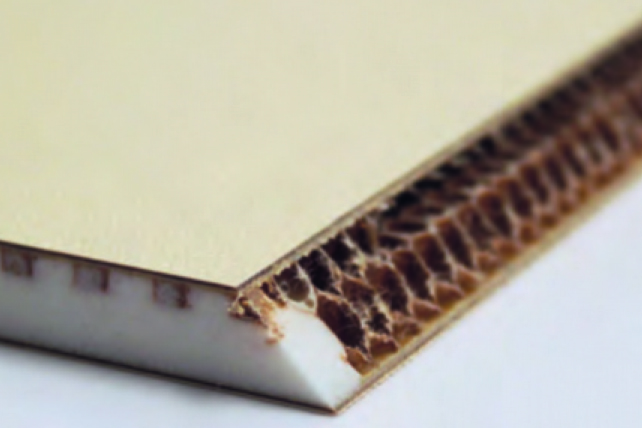 Зріз верхніх шарів HPL, центрального шару з сотами, двокомпонентним заповненням крайки після затвердіння. Для обробки F/LIST використовує дискову пилу LEUCO DIAREX.