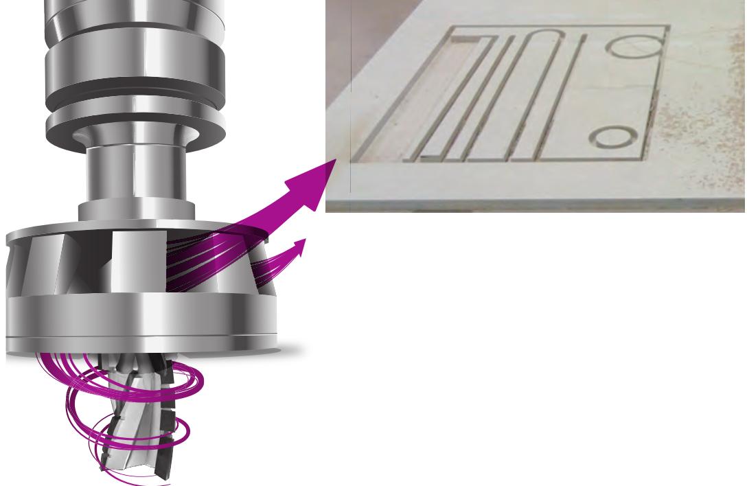 Спрямований потік стружки і пилу при роботі інструменту LEUCO CM зі спеціальним розташуванням ріжучих крайок прекрасно видно на фотографії, так і в процесі фрезерування